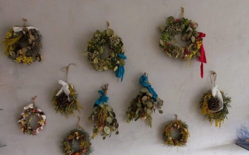 今が季節のミモザのリースやスワッグもあり、ちょっとずつ内容が違うので、選ぶ楽しみがあります。