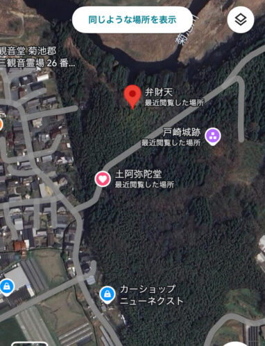 「弁財天」を諦めて、また狭い狭い道を通り山を降りてゆきます。航空写真で見ると、かなり山の中です。