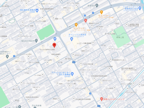 国体道路沿いのローソンやミスタードーナツから曲がった通りにあります。ダイレックス熊本店のちょうど向かい側です。