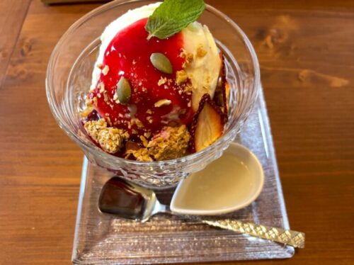 ミキパフェ(650円)もいただいてみましたが、手作りの甘酒グラノーラに、小国ジャージーのアイスクリーム、さらにローゼルのソースやドライストロベリーがトッピングされていて、とっても贅沢!