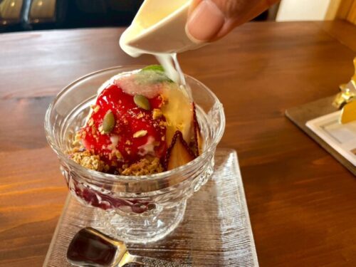 ここにミキをかけていただくのですが、ザクザクのグラノーラとアイス、そしてさっぱりとしたミキのハーモニーが素晴らしく、美味しくいただけました!