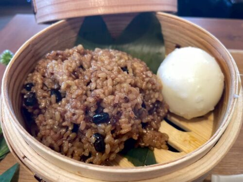 左側のせいろには、酵素玄米に塩麴で味付されたたゆで卵。