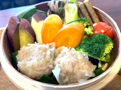 そして右側のせいろには、大きな香心ポークの焼売と、地元産のカラフルな蒸し野菜がぎっしり!