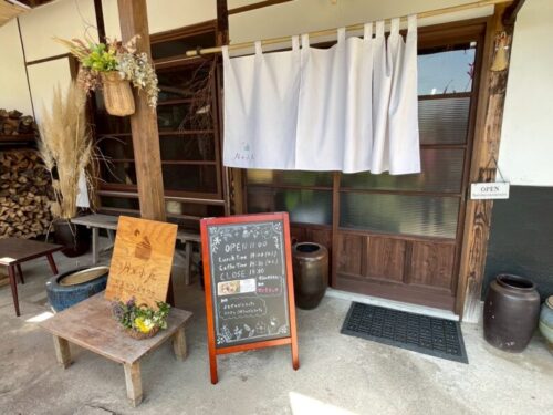 入口には白いのれんがかけられ、野花やドライフラワーがさりげなく飾られているのがとても素敵!ナチュラルな雰囲気に心ときめきます。
