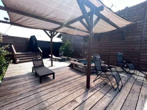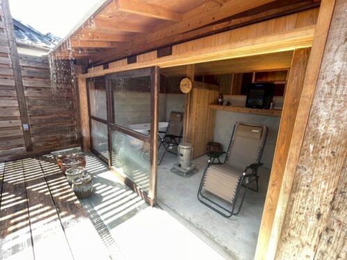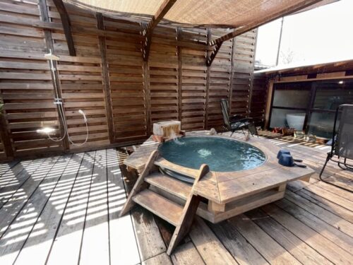 ウッドデッキに水風呂とリクライニングチェアが4つ。そしてサンシェードもあり、のんびり体を休めることができます。