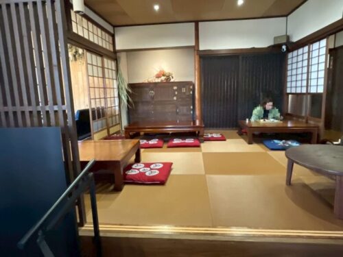 和室に座布団のテーブル席は、お子様連れでものんびり過ごせそう!