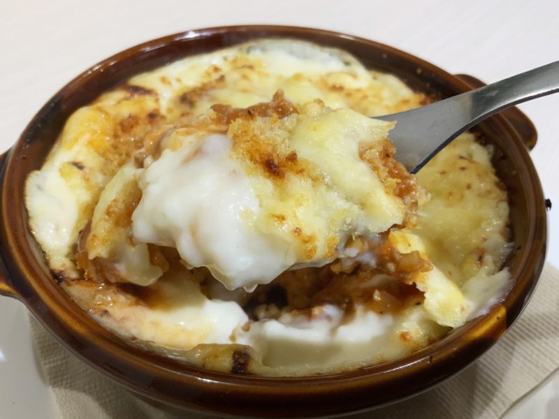 ケチャップライスの上に、ミートソース、ホワイトクリームと層になっていて、表面はこんがり焼き上げられています。