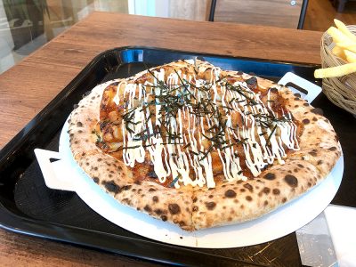 直径25cmとなかなか大きなサイズのナポリピザです。今回は、そのピザの中でも日本生まれの「テリヤキチキンピザ」。