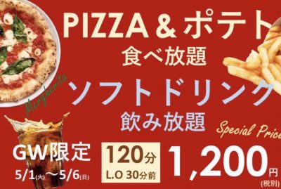 夜メニューにはピザ食べ放題プランなどもありましたが、今回はGW期間中の5月6日までの特別プランの食べ放題が開催。ピッツァ8種 & ポテトが食べ放題、ソフトドリンク飲み放題も付いて120分1200円(税抜)という、なかなかに破格のサービス!