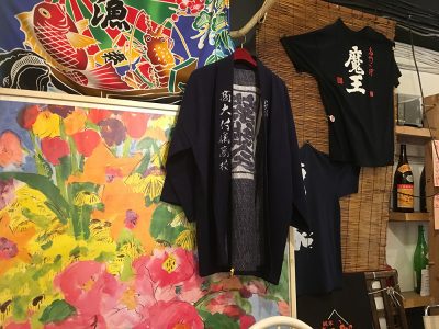 法被だったり、旗だったり、絵画などもそうですが、お店の壁に色々飾ってあったりして、楽しませてくれます。酒瓶とのバランスが面白いですね!