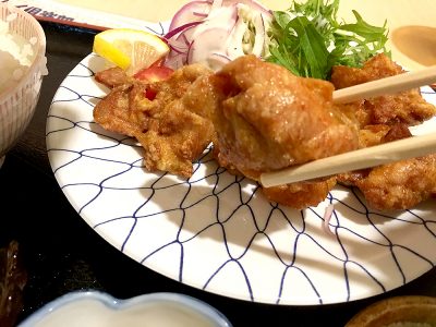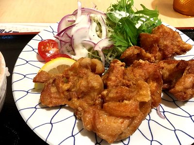 カラリと揚げられた鶏の唐揚げ。食べた食感も良く、醤油の味付けも美味しく引き出しています。