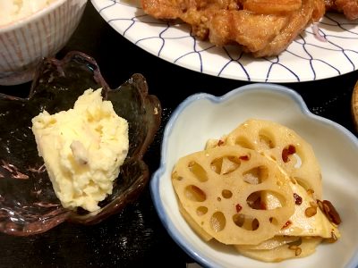 副菜にレンコンがあるのは個人的に嬉しいです。ちょっぴり辛めの味付けがまたベスト!
