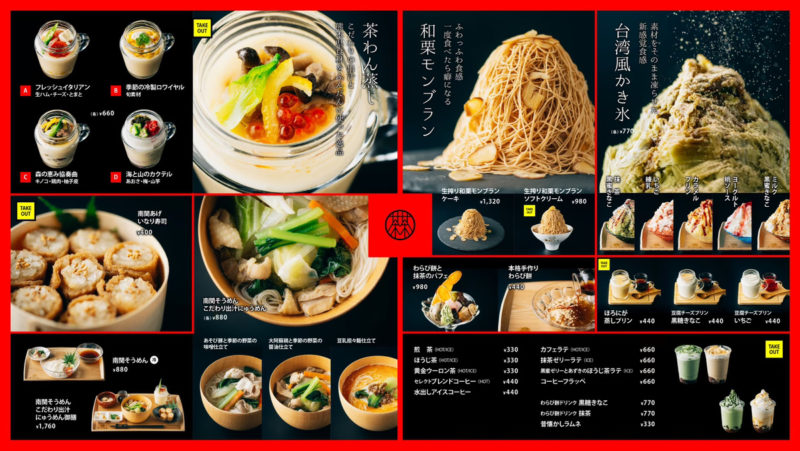 メニューには、茶わん蒸し、いなり寿司、そうめん、モンブラン、ドリンク等。