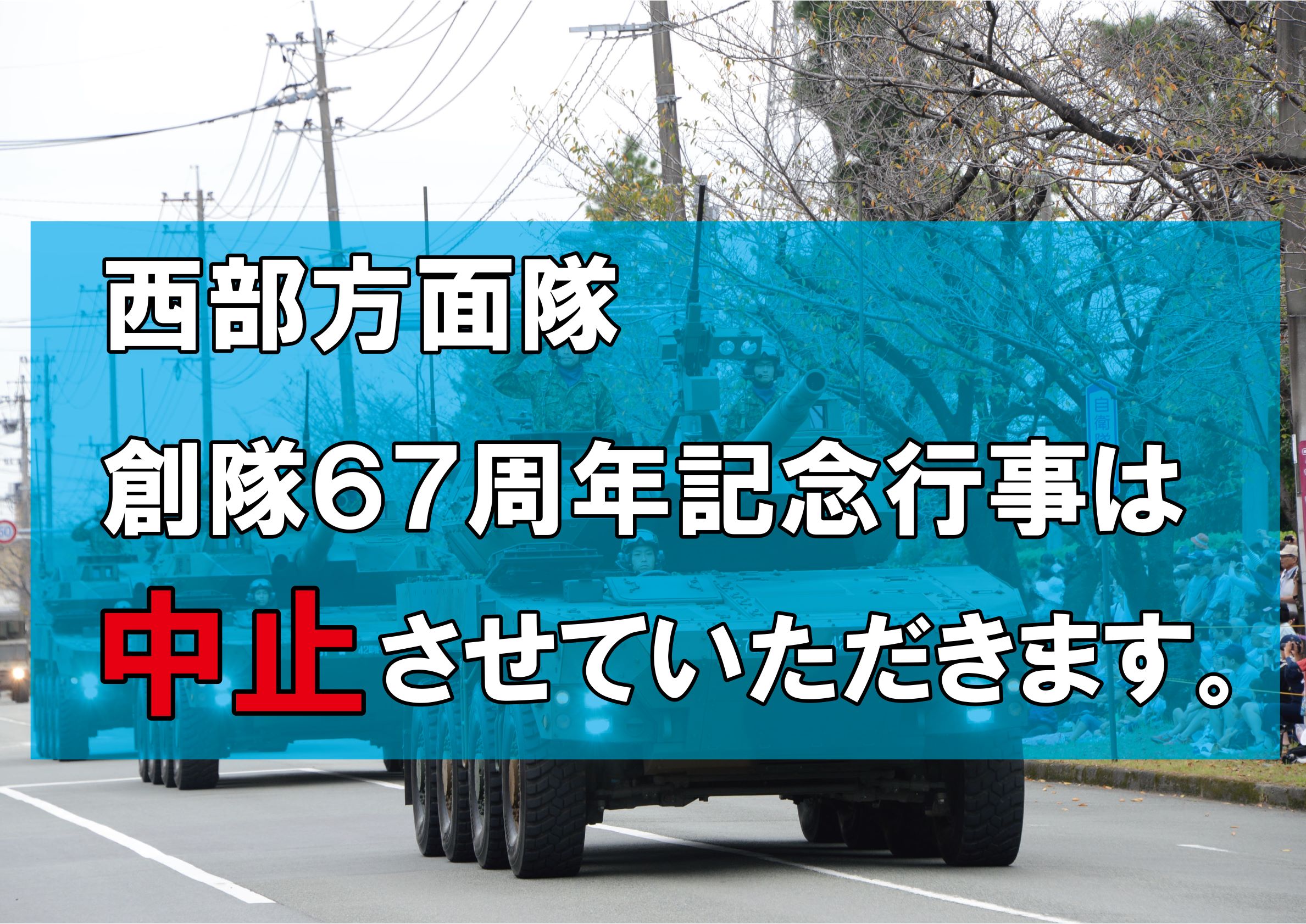 9月19日(月)に健軍駐屯地で予定していた「西部方面隊創隊67周記念行事」は、台風の接近に伴う風雨を鑑み、中止いたします。