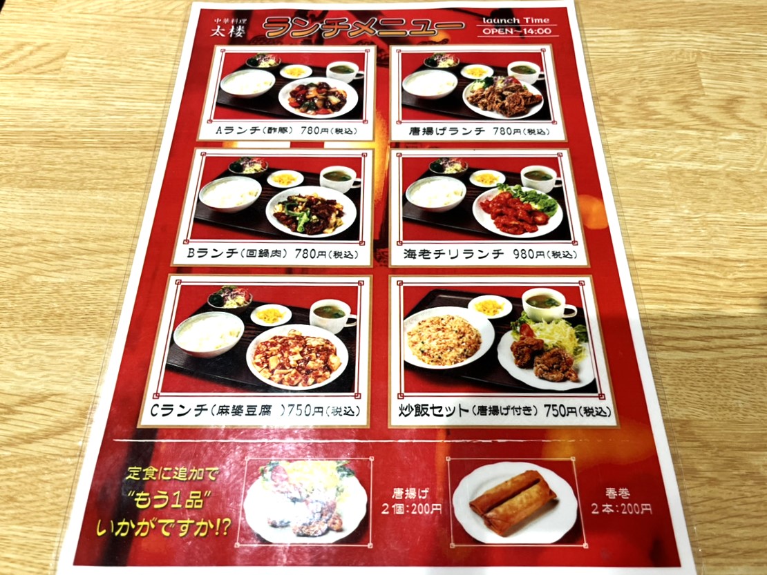 ランチメニューはこちら。6種類あって、プラス200円で唐揚げや春巻を付けることもできます。
