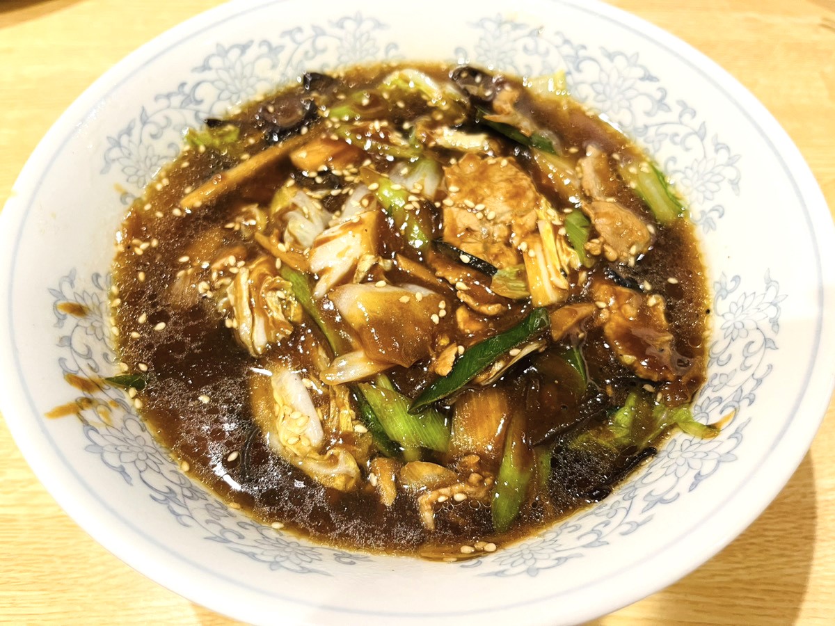 メニューを見て美味しそうだったので、天津飯も注文。ご飯の上に、カニ玉が鎮座しているタイプ。そしてたっぷりの餡がだくだくと掛かっています。