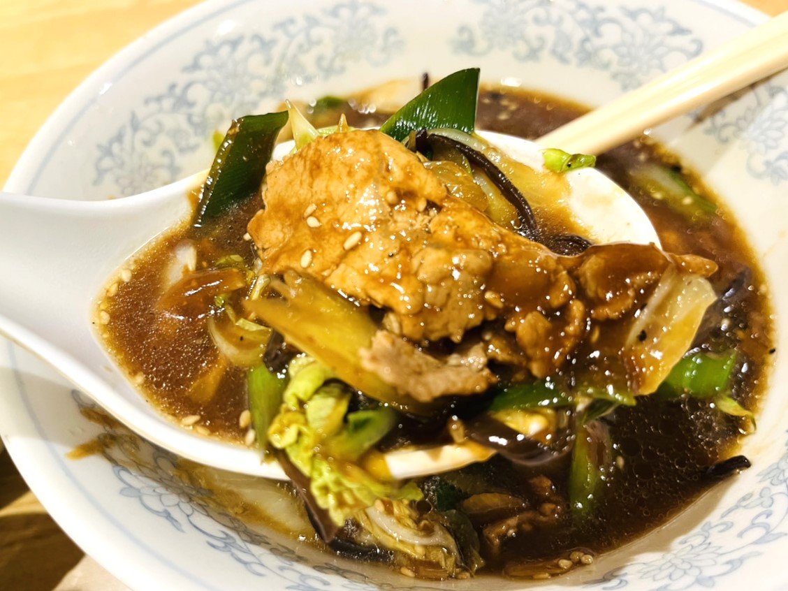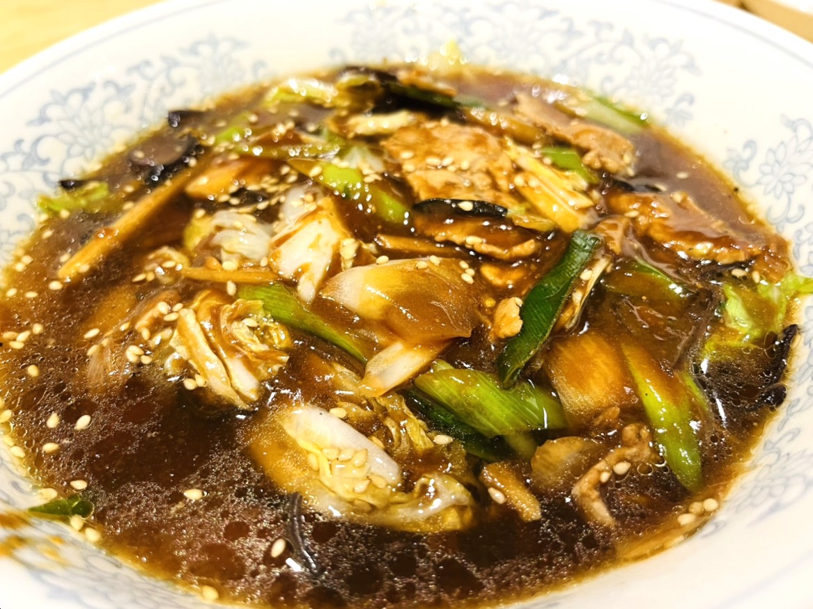 麺の上にはたっぷりのお肉と野菜。それにしても、この色は?と思いますよね。お肉と野菜は味噌で炒めてあるそうです。そして、ラーメンのスープは醤油味。