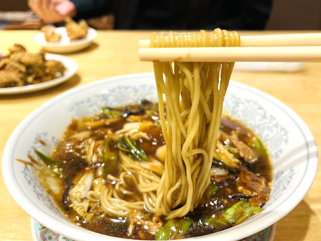 一般的な醤油スープのようにあっさりしていなくて、味噌味ほど濃くもない。不思議な味わい。食べ進めるうちに、醤油と味噌が混ざってなんとも言えないバランス感。どんどんハマっていく味です。