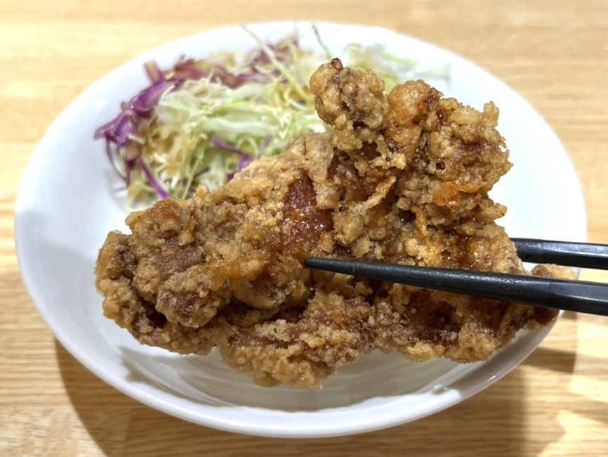 衣はサクサク通り越えてザクザクとした食感。下味がしっかり付いていて濃い味!スパイスも使われているようで、カレー風味の唐揚げです。これはご飯も進むし、ビールも欲しくなります。