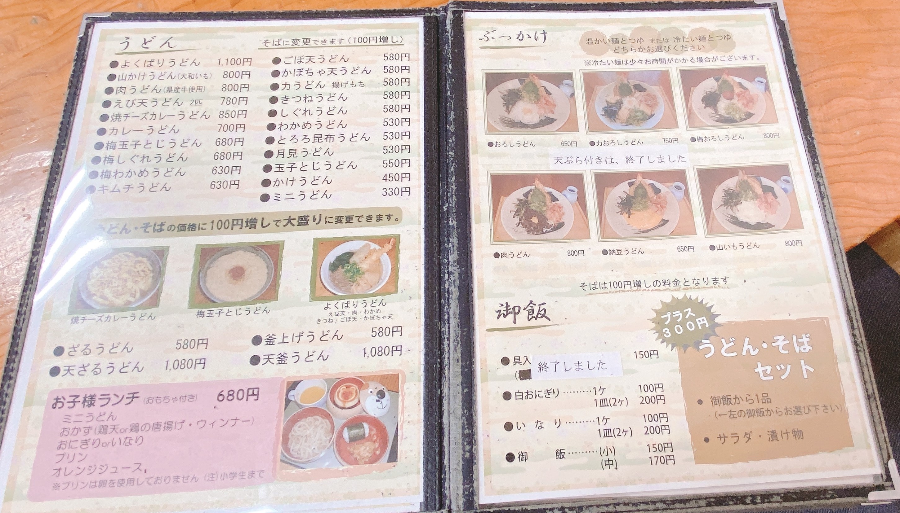 1ページ目は定番のうどんに釜揚げうどん、ぶっかけうどん。お子様ランチもあります。