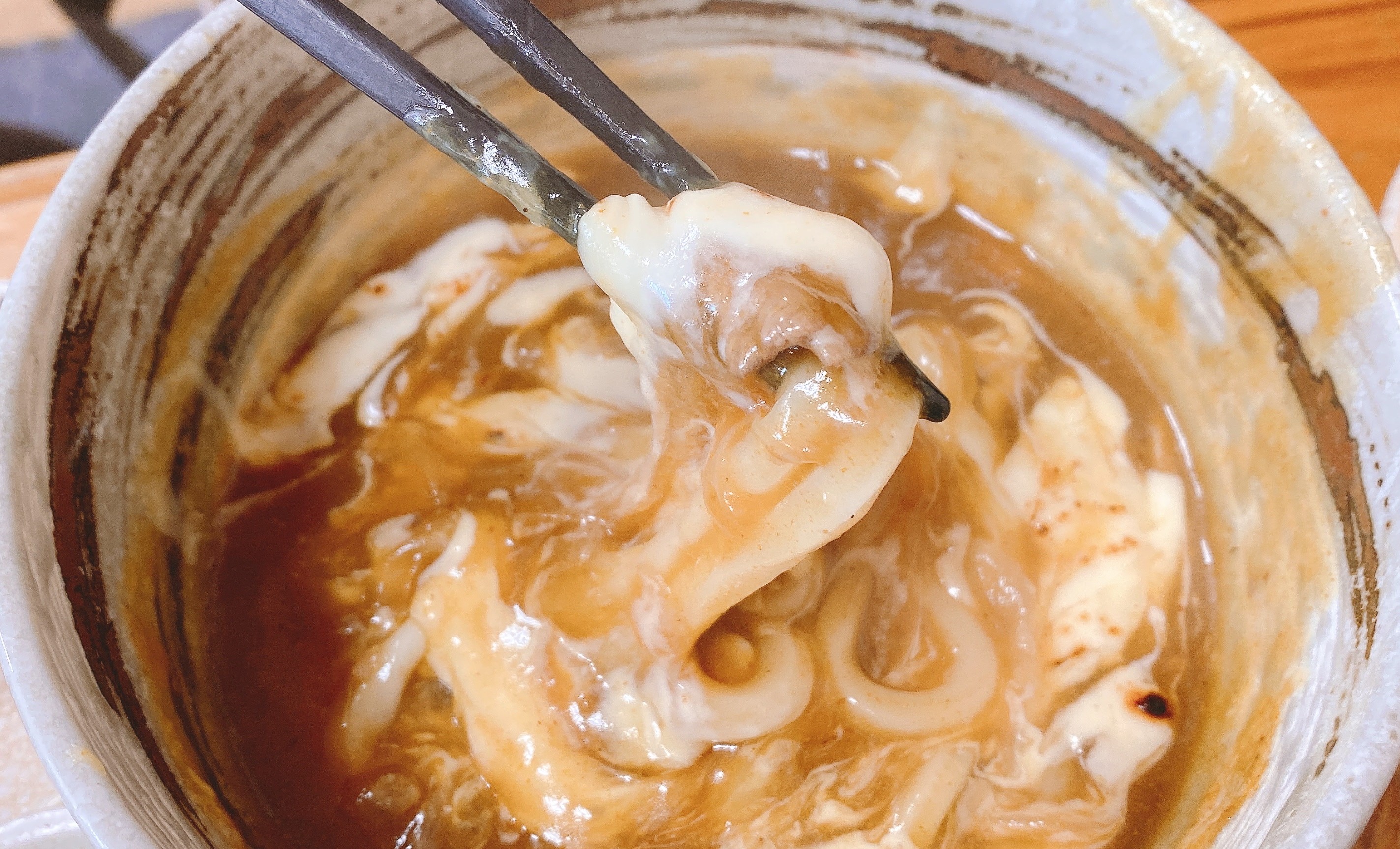 甘いカレーとチーズのバランスが良く、お子様でも食べられる優しい味のカレーです。うどんの麺が良く絡みスープのようにいただけます。
