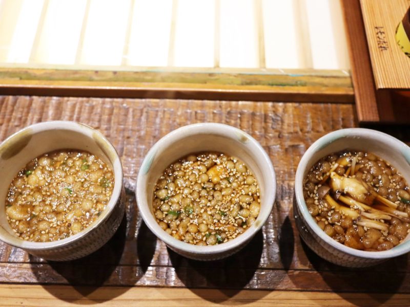 今回はダシを3つ注文。左から基本ダシ、肝醤油ダシ、きのこダシです。変わり種は味の想像できませんが、めちゃくちゃいい香りします。