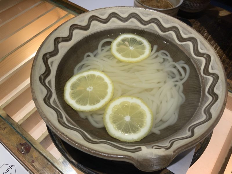 うどんはこんな感じでお湯に入った状態で出てきます。これにダシをつけて食べるのですが…