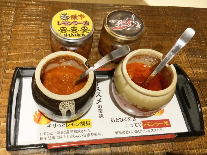 辛いのが好きな人は店員さんにお願いすると「超激辛レモンラー油」や「ロンギヌスの一撃」というアホみたいに辛い薬味も提供してもらえます。