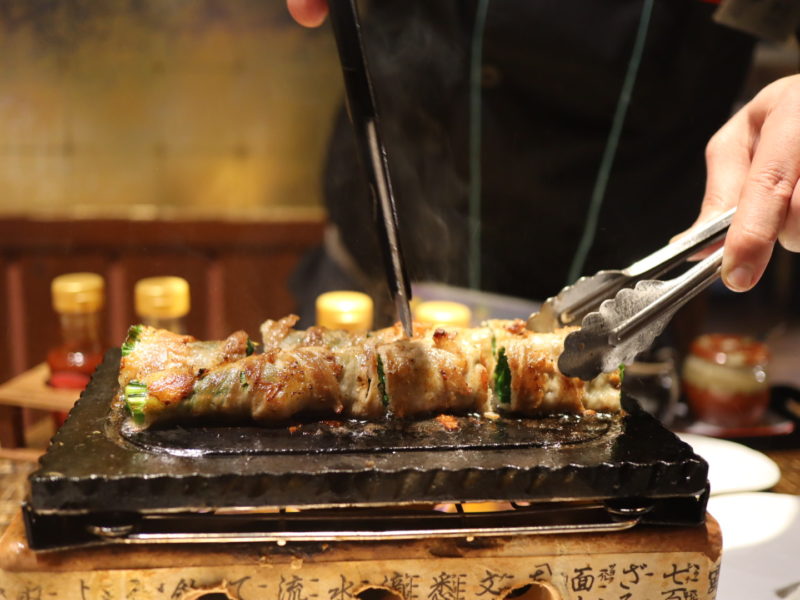 豚バラ肉で巻かれたネギの束を鉄板で焼いて食べる「ネギトルネード」