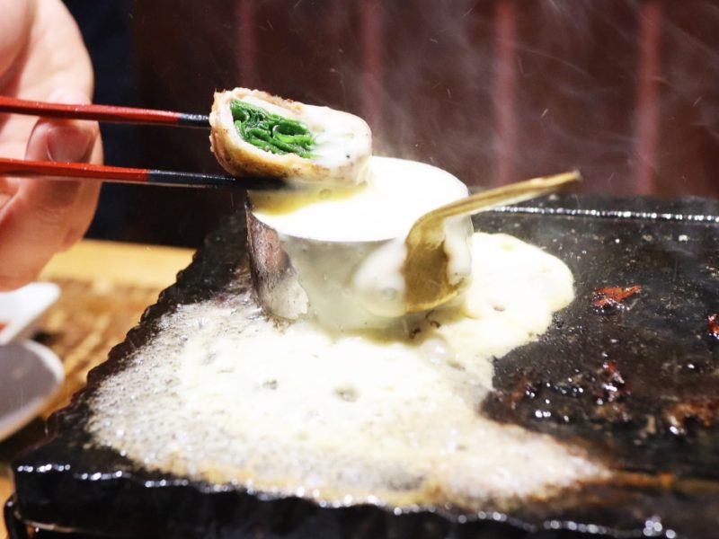 こんな感じでチーズでフォンデュして食べると最高です。他にもタレが3種類あるので、お好みの味でどうぞ!