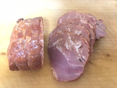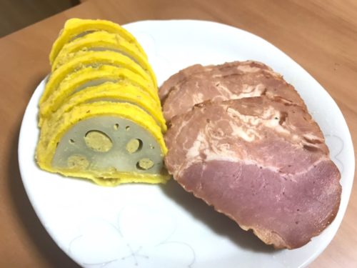 次に、公式レシピを忠実に再現するために、滅多に買わない焼き豚も買ってきて、こちらも薄く切ります。