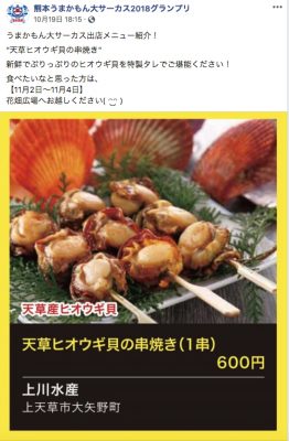 「熊本うまかもん大サーカス」の公式Facebookページでは、出店する店舗の料理が1品ずつ解説付きで紹介されています。まだ現段階では数店舗分ですが、おそらく開催日前までには全店舗の紹介が掲載されるかと思いますので必見です!
