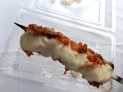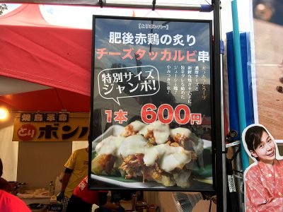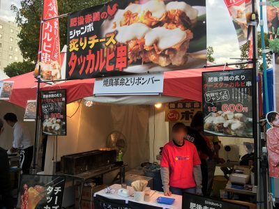 限られた予算内でお店を廻りました。まずは一通り会場内を廻り、いの一番に見つけたのが、「焼き鳥革命とりボンバー」の一品「チーズタッカルビ串」です!