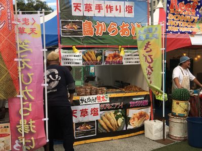 すでに2料理で1200円使いまして、残りはチケット一枚300円分。じゃそれでコーヒーでも買おうかなと思っていましたが、そこで「天草水産研究所」さんのブースで「芝エビ唐揚げ」と「きびなごフライ」が、通常600円を半額の300円で提供!