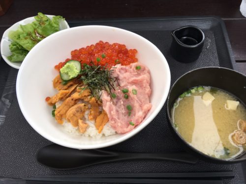 ランチはローストビーフ丼や海鮮丼が人気とのことで、うに・いくら・ネギトロの三色丼をいただいてみました。