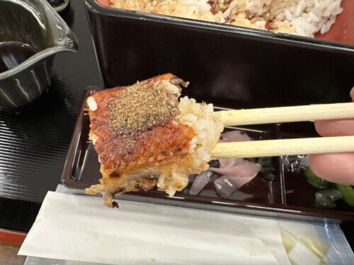 おススメの食べ方、ワサビとネギをのせて食べてみると、ワサビがうなぎのこってり感をやわらげ、あっさりと食べられます。