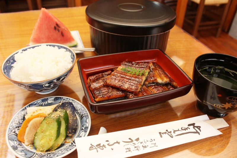 うなぎが1尾に肝吸、ご飯(おひつごと!)、お漬物、季節の果物がついてきます!
