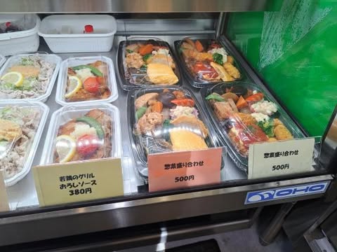 「チキン南蛮」「ゆで豚の葱・生姜たれ」「若鶏のグリルおろしソース」、500円の「お惣菜の盛り合わせ」などがありました。