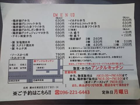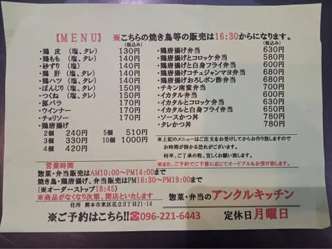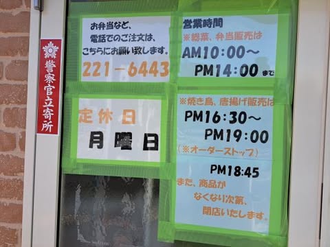 | 営業時間 | 10時~14時(お弁当、総菜、唐揚げ販売) 16時30分~19時(焼き鳥、お弁当、唐揚げ販売) ※商品なくなり次第閉店 |