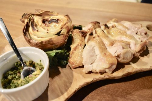 九州産ハーブ鶏のグリルは、お肉が分厚い! ハーブとエシャロットソースはお好みでかけられます。グリルオニオンは熱いので、運ばれた直後に食べると猫舌な方は大変なことに。