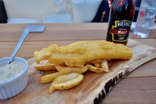 フィッシュ&チップスもこの迫力! かけるビネガーが大麦、とうもろこし、水だけしか使っていないので味を引き立ててくれます。