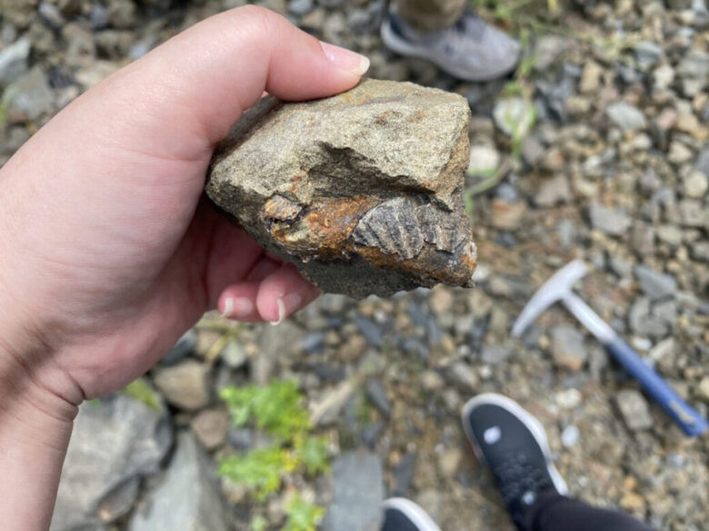 「はいここですよ。この石の中に化石がある可能性があるので、割って探してみましょう」
