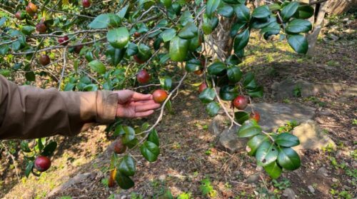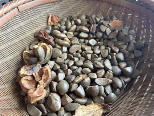 これが椿の実です。こちらを収穫し中の種を取り出して搾ることで「椿油」が作られます。
