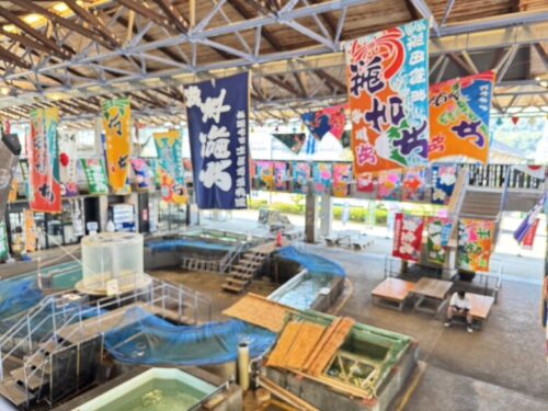 この道の駅は大漁旗と、ど真ん中に大きな生簀がドーンとあるのが特徴。お魚が回遊しています。