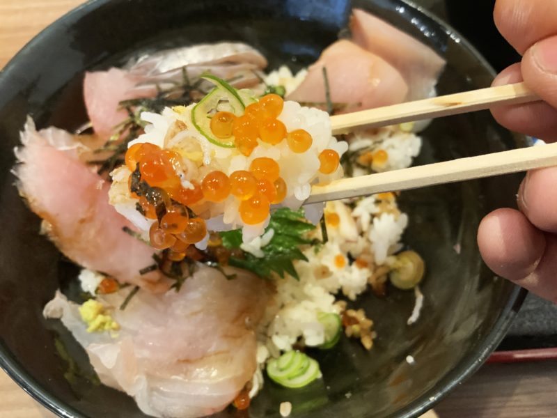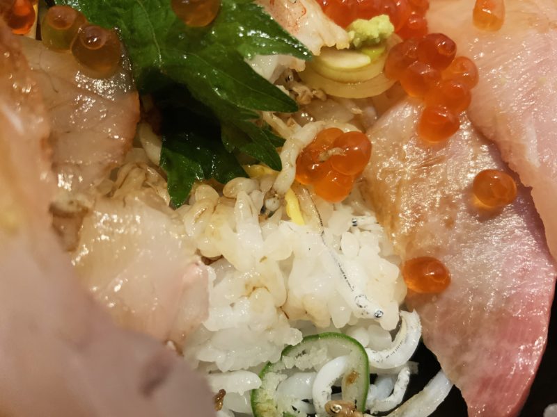 贅沢なほどお刺身が乗って、いくらまでトッピング。天草まで行ってもこのレベルで1300円の海鮮丼なんて、滅多にお目にかかれません。