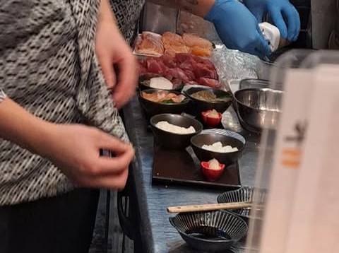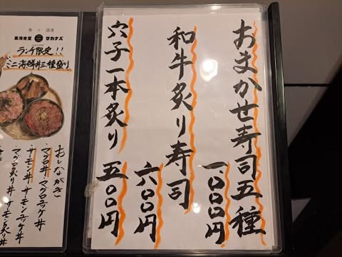 ランチはほとんどの人がミニ海鮮丼3種盛を頼んでいましたが、他にもお任せ寿司5種や和牛炙り寿司、穴子1本あぶりもありますよ。