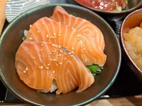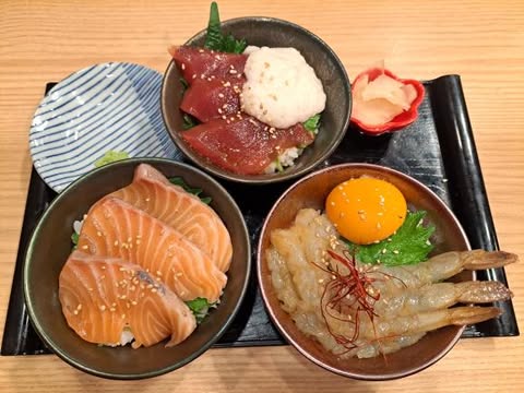今回ライターが頼んだのはサーモン丼、マグロユッケの山かけ丼、エビユッケ丼の卵付きの3色丼になりました。