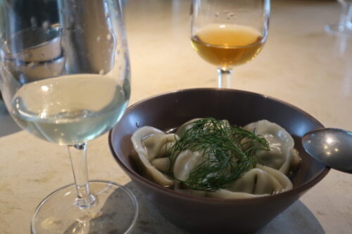さっぱりとした水餃子とお店オススメの白ワインを。