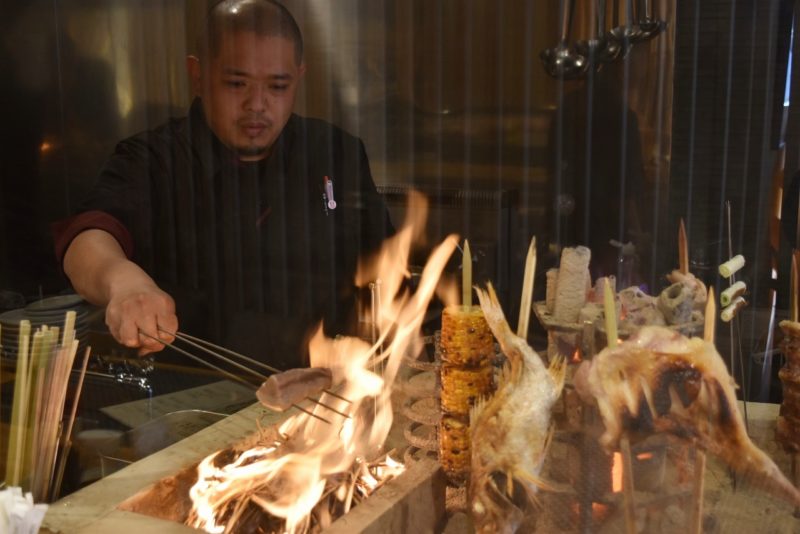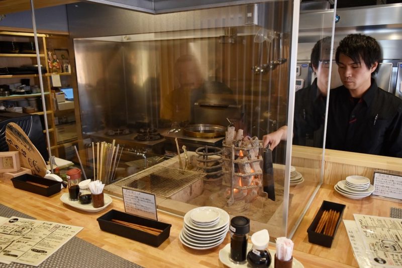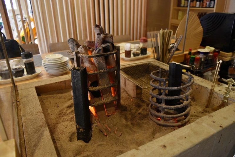 カウンターの前にあるガラス張りの一角。そこには積み上げられた炭が燃えていました!この周りで魚や肉を焼いてくれるそう。