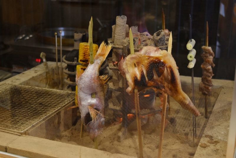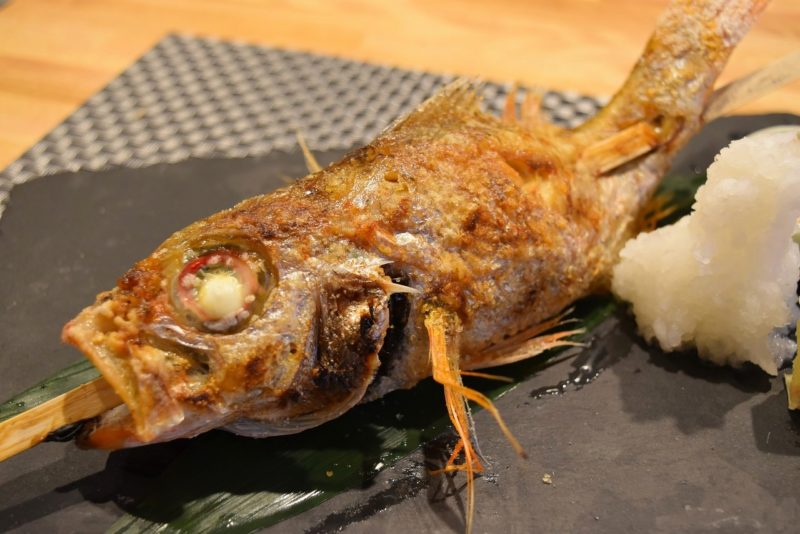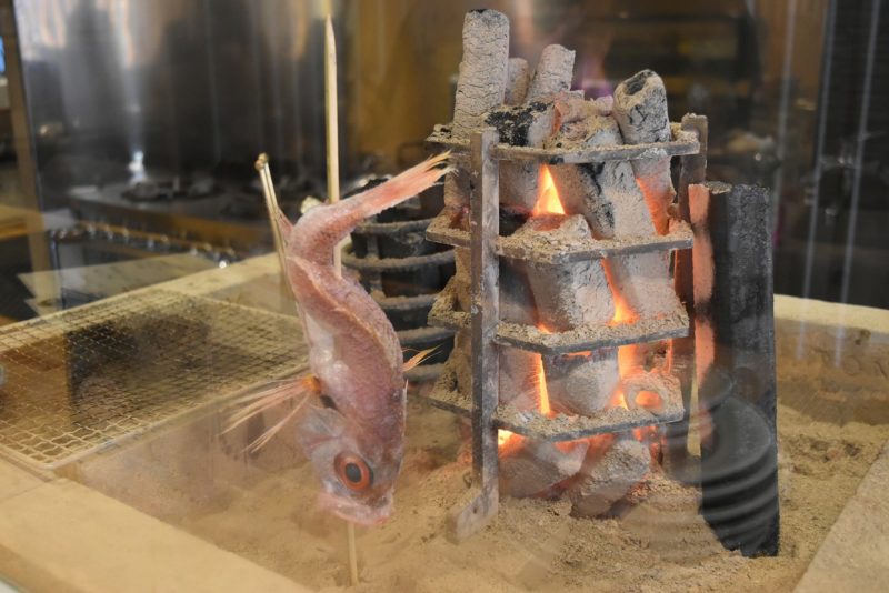 ということで、まずは店長おすすめののどぐろ!生ののどぐろに塩で味を付け、ワイルドに串を差し、そのまま突き刺して焼き上げます!とても原始的ですが、意外とこういう焼き方ってしたことないですよね。私達のご先祖さまも大昔にはこんな風に食べ物を焼いて食べていたのでしょうか。
